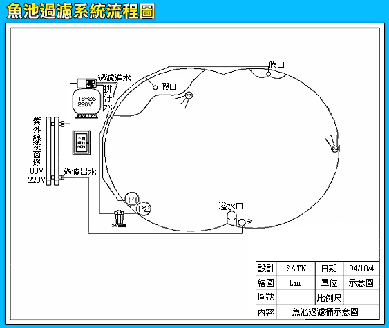 過濾泵浦→除毛器→全自動魚池過濾桶→紫外線殺菌燈→過濾出水